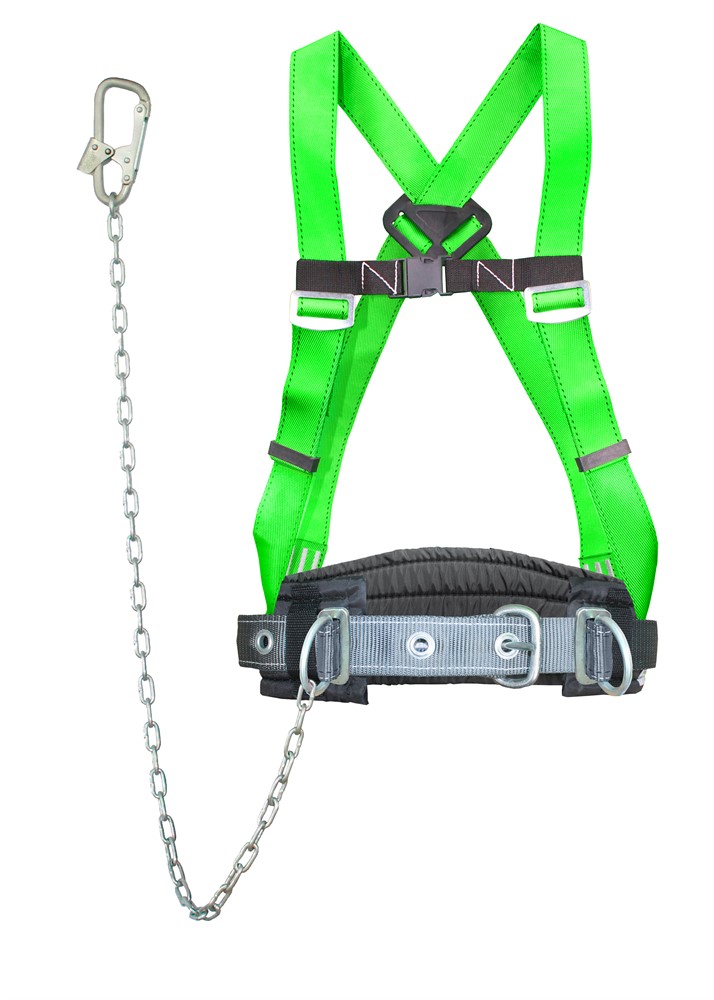 Пояс состоит из ремня с пряжкой, уширенного (широкого) кушака, наплечных лямок, двух D-колец на поясе и одного на спине (для страховки или спасательных работ и экстренной эвакуации) и стропа - металлическая цепь с монтажным карабином. Пояс упакован в водонепроницаемый пакет и содержит паспорт и инструкцию по применению.