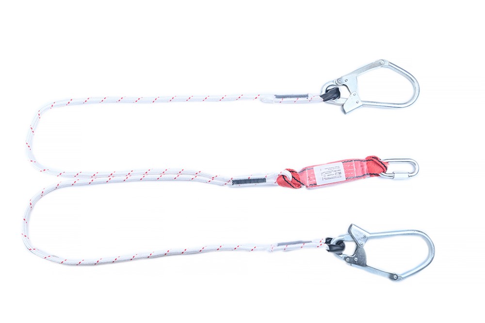 Строп аВд К50+Кс (канат в оплетке) - страховочный строп, двойной (двуплечий) из капроновой верёвки с амортизатором, двумя большими монтажными и одним соединительным карабином.
