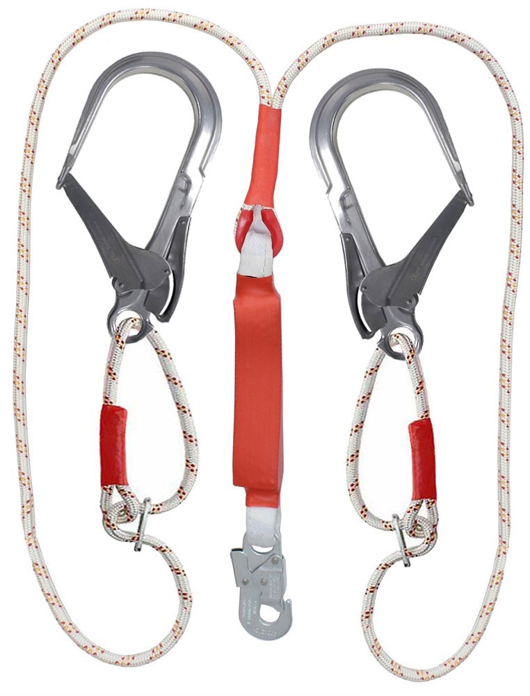 Строп аВрегд К110+К20 NL (канат в оплетке) - страховочный регулируемый двойной (двуплечий) строп из капроновой верёвки с амортизатором, двумя большими монтажными карабинами и одним малыми монтажными карабинами.