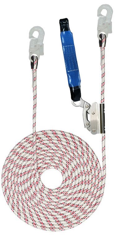 Зажим на гибкой анкерной линии ползункового типа (не разёмное страховочное устройство ползункового типа, оснащенное автоматическим замыкающим механизмом. Материал – сталь с гальванопокрытием. Используется с канатом с сердечником низкого растяжения диаметром 12 мм., концы стропа зашиты пластиковые коуши). Комплектуется блокирующим устройством ползункого типа с амортизатором рывка.