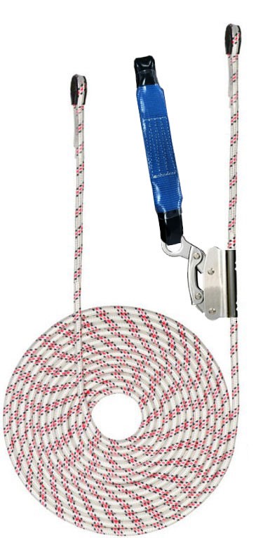 Зажим на гибкой анкерной линии ползункового типа (не разёмное страховочное устройство ползункового типа, оснащенное автоматическим замыкающим механизмом. Материал – сталь с гальванопокрытием. Используется с канатом с сердечником низкого растяжения диаметром 12 мм., концы стропа зашиты пластиковые коуши). Комплектуется блокирующим устройством ползункого типа с амортизатором рывка.