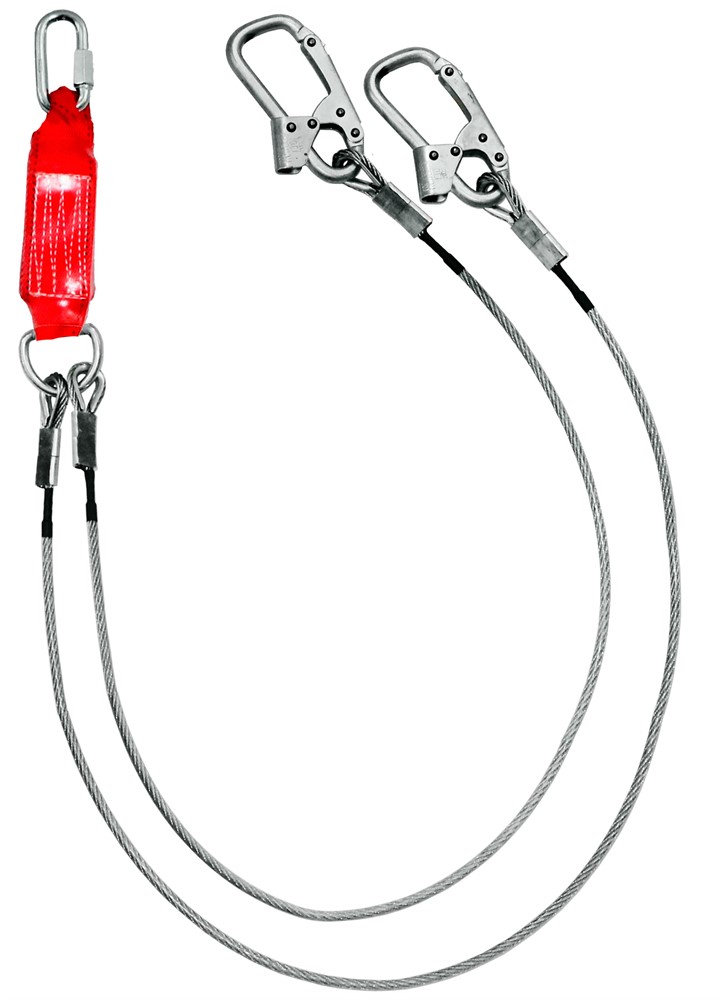Строп аБд+Кс - страховочный строп, двойной (двуплечий) из металлического троса в ПВХ оболочке с амортизатором, двумя монтажными и одним соединительным карабином