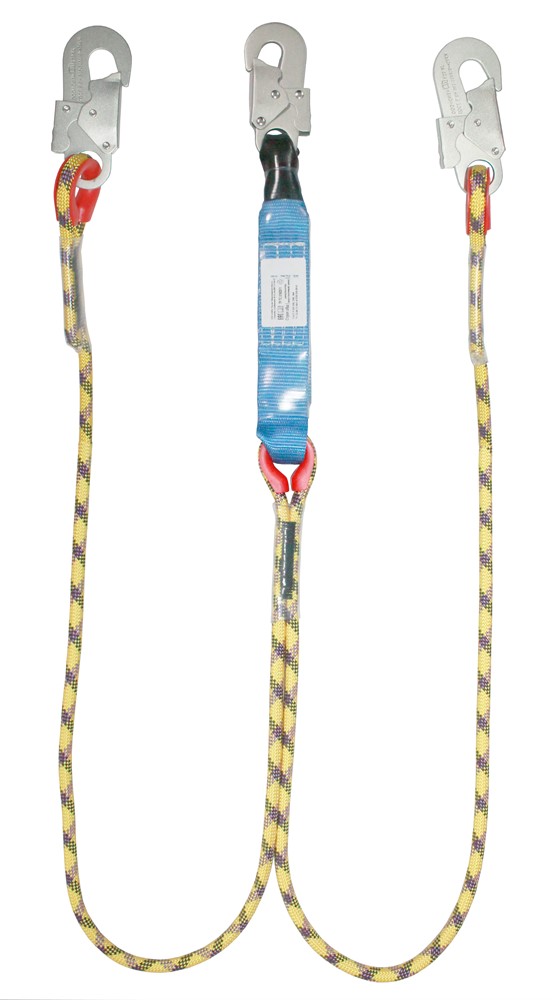 Строп аВд К20+К20 NL (канат в оплетке) - страховочный двойной (двуплечий) строп из капроновой верёвки с амортизатором, тремя малыми монтажными карабинами.