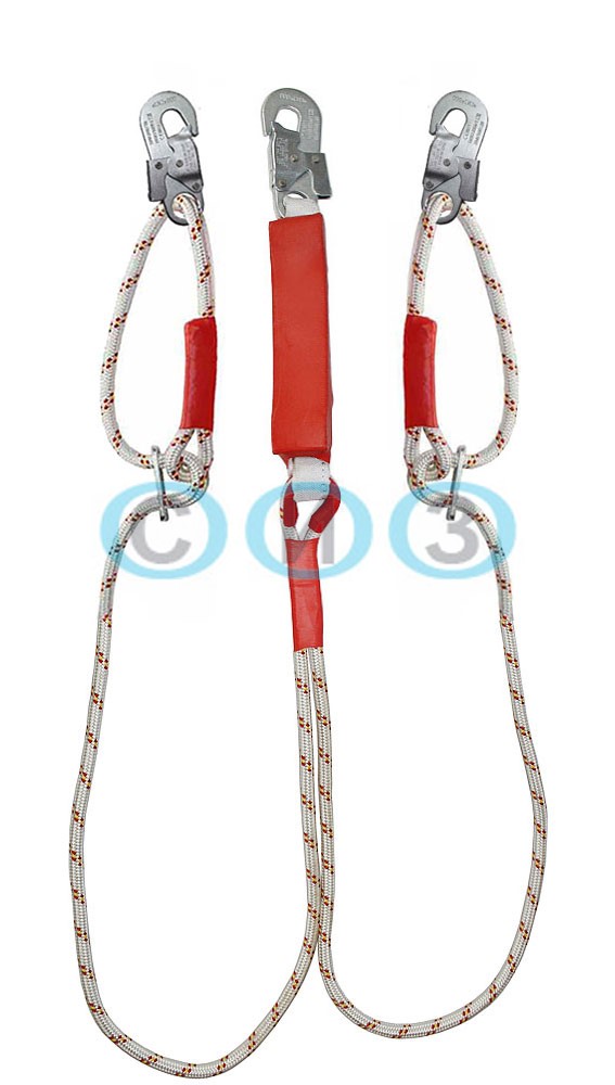 Строп аВрегд К20+К20 NL (канат в оплетке) - страховочный двойной (двуплечий) строп из капроновой верёвки с амортизатором, с тремя малыми монтажными карабинами.