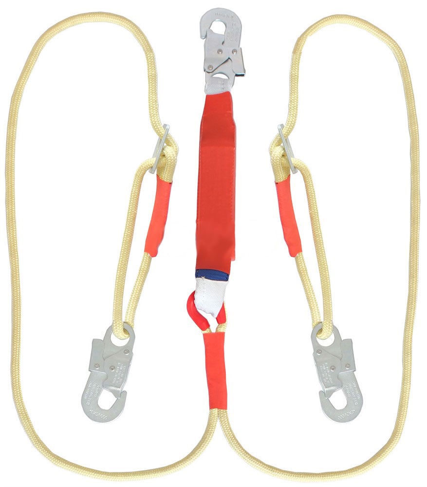 Строп аВеррегд К20+К20 NL - страховочный регулируемый строп, двойной (двуплечий) из каната с оплеткой из арамидного огнеупорного волокна с амортизатором в чехле из огнеупорного материала и тремя малыми монтажными карабинами.