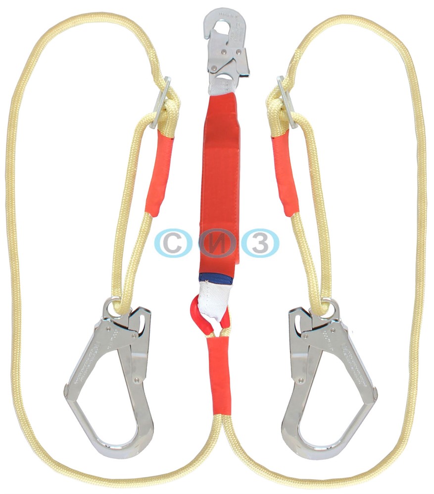 Строп аВеррегдог К50+К20 NL - страховочный регулируемый строп, двойной (двуплечий) из каната с оплеткой из арамидного огнеупорного волокна, с амортизатором в чехле из огнеупорного материала, двумя большими монтажными карабинами и одним малым монтажным карабином.