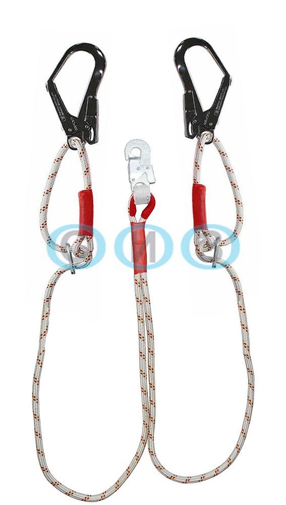 Строп Врегд К50+К20 NL (канат в оплетке) - страховочный регулируемый двойной (двуплечий) строп из капроновой верёвки с двумя большими монтажными карабинами и одним малыми монтажными карабинами.